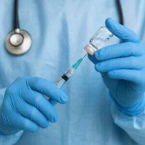 It shows the healthcare workers wearing nitrile gloves for safe injections.